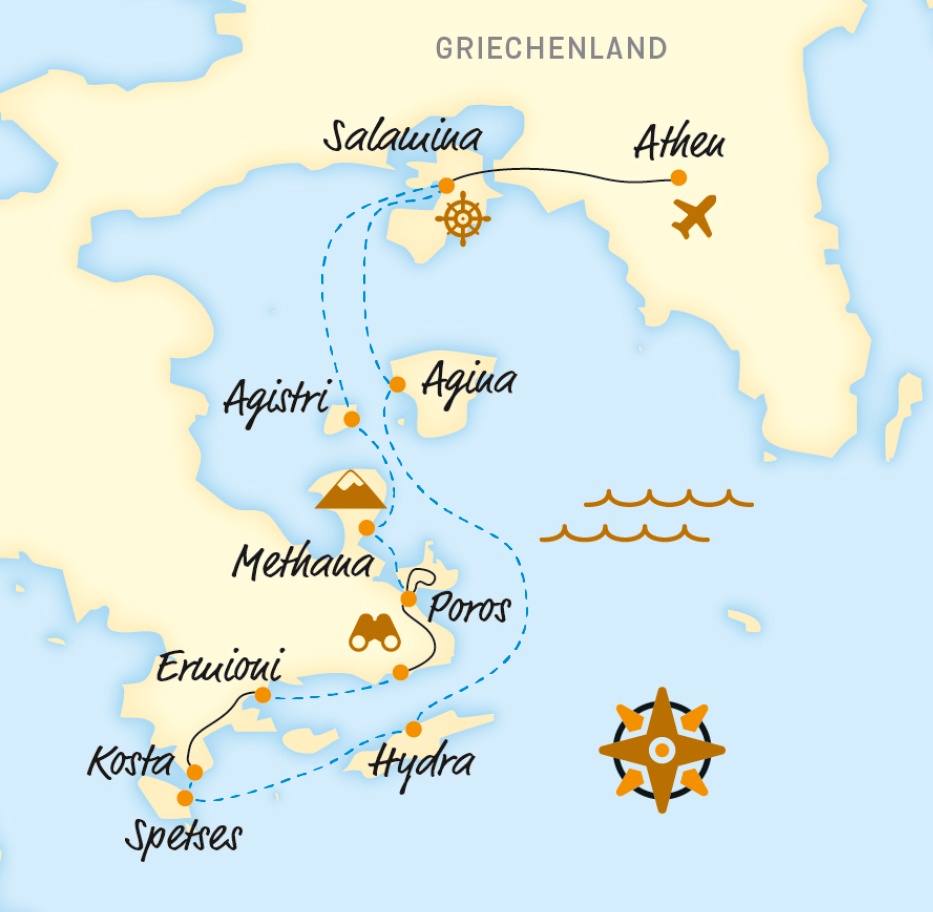 *Anmerkung Tag 5: sollte der Hafen in Spetses bereits voll sein, fahren wir mit dem Boot zurück nach Ermioni und verbringen dort die Nacht.